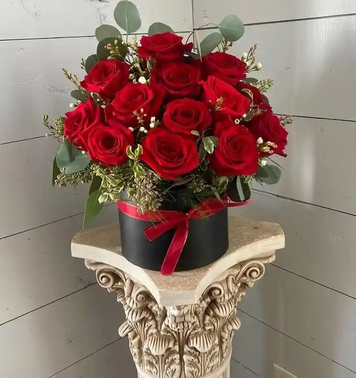 Elegancia en cada detalle ✨ 13 Rosas Rojas frescas y eucalipto en un cilindro sofisticado, perfecto para expresar amor, admiración o pasión con estilo.