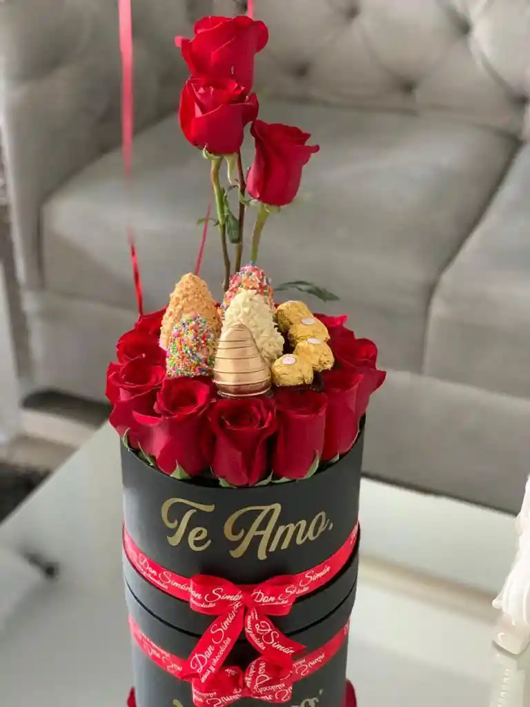 Cilindro con rosas de un solo tono, letrero en madera, 5 fresones y 4 chocolates Ferrero, globos en helio y tarjeta mensaje. (Color de rosas y caja según disponibilidad)