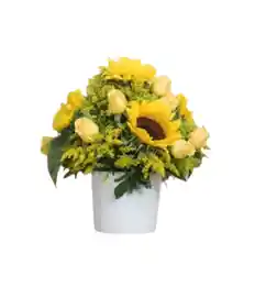 Cilindro de 6 girasoles , 12 rosas amarillas y 15 varas de solidago. La flor puede ser sustituida dependiendo la disponibilidad de color y del producto “Mensaje Personalizado” máximo de 30 caracteres (Dejar el mensaje en el chat, los comentarios no se previsualizan para la tienda por lo que si se dejan allí no podrá ser incluido)