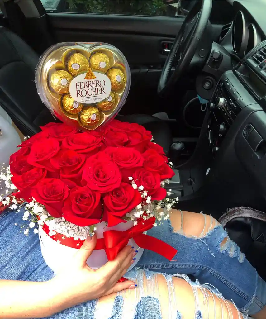 Cilindro de Rosas rojas con corazón de ferrero de 8 unidades ,incluida tarjeta personalizada ideal para el Amor