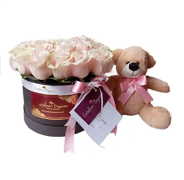 Caja de carton negra cilindrica con 20 Rosas Rosadas acompañado con follajes y cintas satinada. Oso de peluche de color claro