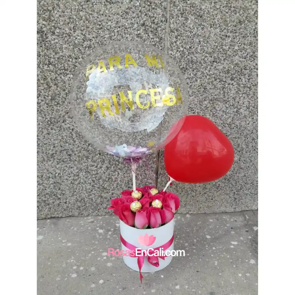 CILINDRO DE ROSAS, CHOCOLATES, GLOBO BURBUJA PERSONALIZADO, GLOBO LATEX, MOÑO Y TARJET.