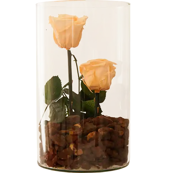 Arreglo floral en Cilindro de vidrio con dos rosas naturales preservadas tamaño estándar (6cm diámetro), que perduran intactas por meses y corteza de pino. Color a elección. Tamaño del arreglo 25cmx14cm. Viene en Bolsa de lujo e Incluye tarjeta.