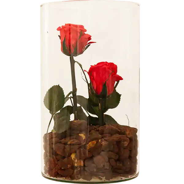 Arreglo floral en Cilindro de vidrio con dos rosas naturales preservadas tamaño estándar (6cm diámetro), que perduran intactas por meses y corteza de pino. Color a elección. Tamaño del arreglo 25cmx14cm. Viene en Bolsa de lujo e Incluye tarjeta.