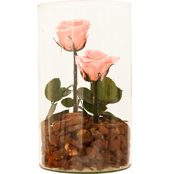 Arreglo floral en Cilindro de vidrio con dos rosas naturales preservadas tamaño estándar (6cm diámetro), que perduran intactas por meses y corteza de pino. Color a elección. Tamaño del arreglo 25cmx14cm. Viene en Bolsa de lujo e Incluye tarjeta. de color Rosa ideal para el Felicitaciones