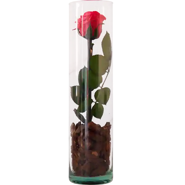 Cilindro de vidrio con rosa estándar natural preservada, (6cm diámetro) que perdura intacta por meses y tronco de pino. Color a elección. Tamaño del arreglo 30cmx8cm. Viene en Bolsa de lujo e Incluye tarjeta.