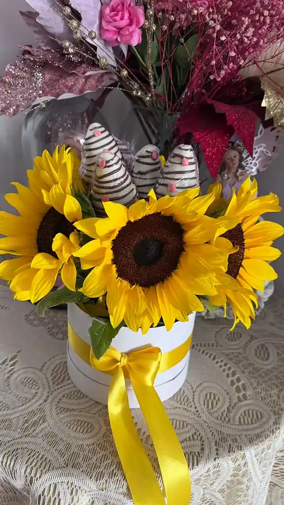 6 A 7 GIRASOLES GRANDES Y 5 FRESAS TAMAÑO JUMBO. TAMBIEN INCLUYE EMPAQUE REGALO