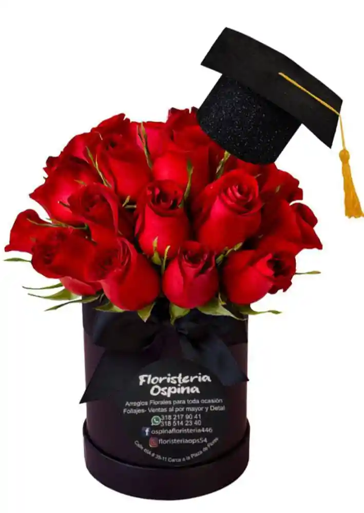 Cuando el esfuerzo se viste de rojo pasión. Este majestuoso arreglo combina el poder simbólico de las rosas rojas —que representan admiración, respeto y amor profundo— con una caja negra de lujo y un birrete de graduación que sella el triunfo con elegancia. Es el detalle perfecto para decir: "Estoy orgulloso(a) de ti." Creado con amor por Floristería Ospina, expertos en transformar emociones en flores. 💌 Si deseas incluir una tarjeta personalizada, no olvides solicitarla al momento de la compra. 🎁 El diseño del birrete, caja y cinta puede variar según disponibilidad en tienda. 🎈 Puedes complementarlo con chocolates, peluches, globos o licor. ¡Todo está disponible en nuestra tienda para hacerlo aún más inolvidable! 💬 Sugerencia de mensaje para la tarjeta: "Tu disciplina floreció y hoy cosechas el éxito. ¡Felicidades, graduado(a)!"