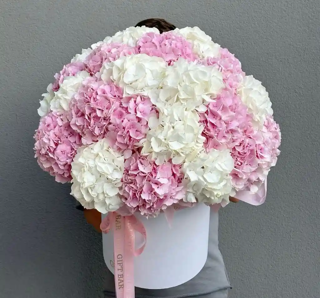 Cilindro de hortensias blancas con rosada
