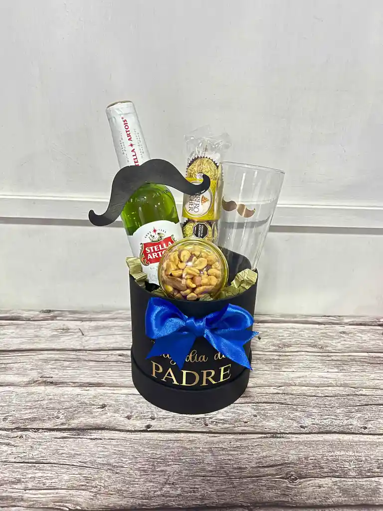 Cilindro mini tipo ancheta con Ceveza Stella, Vaso cervecero, Chocolates Ferreros Rocher y Frutos secos COLOR DE CAJA DE ACUERDO A DISPONIBILIDAD. ESPECIAL DE PADRES, DIA DEL PADRE. HOMBRE