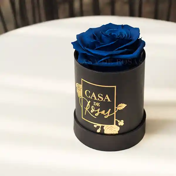 Cilindro en caja tradicional con rosa preservada (duración mínima de 1 año). La rosa se envía en bolsa de regalo, con tarjeta de cuidados y sobre con mensaje personalizado.