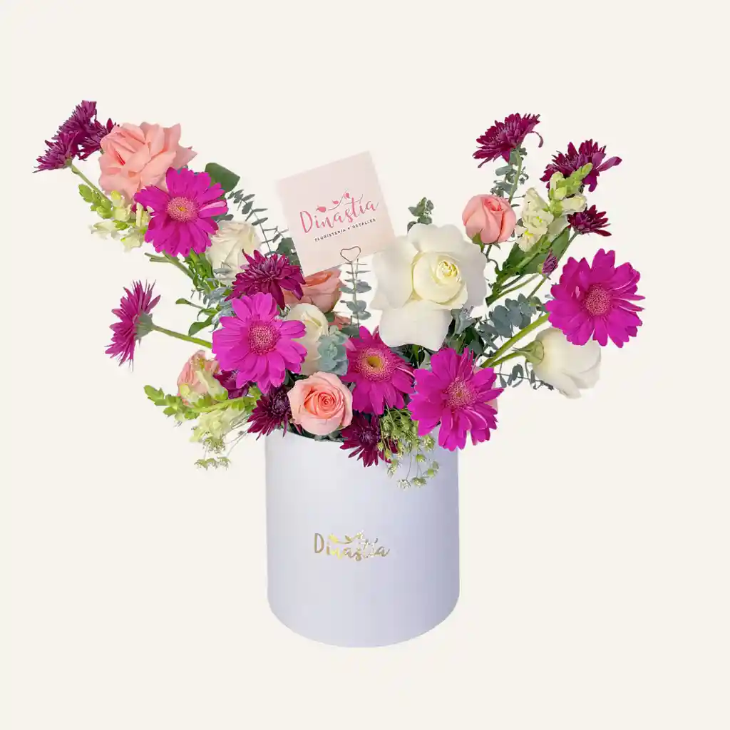 Cilindro de flores, en tono tropical con gerberas, rosas boca de dragon, velo de novia, pompones y eucalito. Tarjeta con dedicatoria