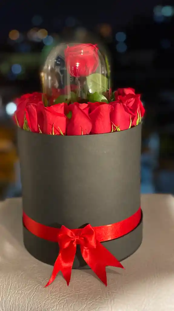 Caja cilindro de rosas naturales con una rosa eterna en urna de vidrio y base de madera.