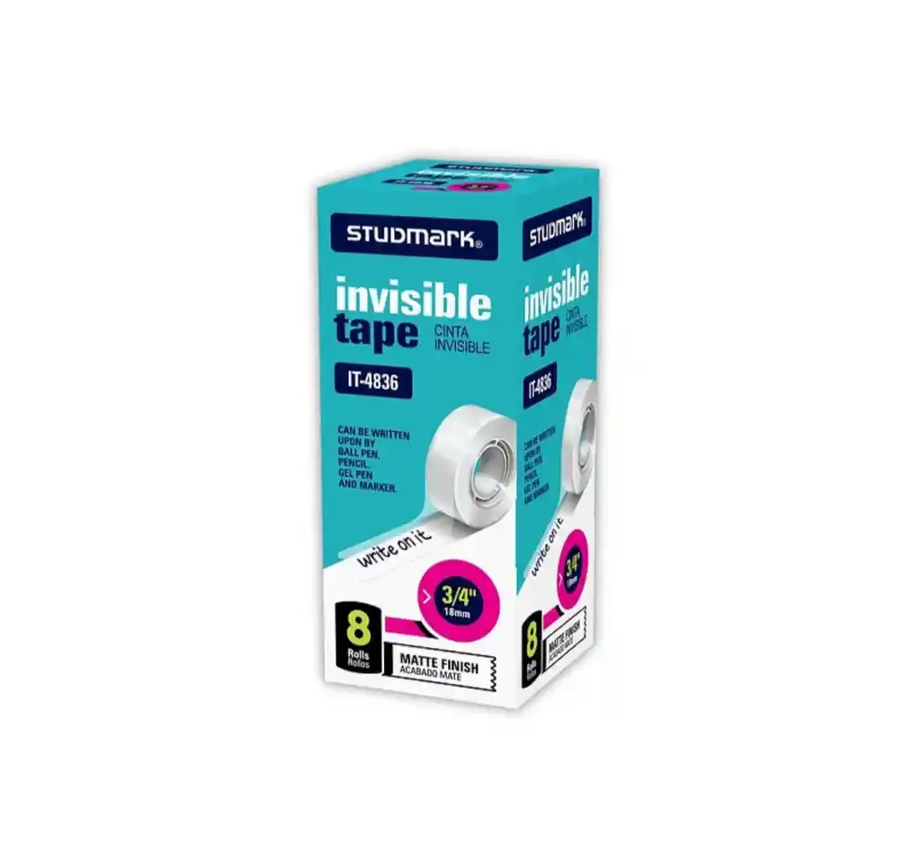 📎 Cinta Adhesiva Invisible Studmark Acabado Mate – Ref. 6502 | 18 mm x 25 m La Cinta Adhesiva Invisible Studmark 6502 es ideal para trabajos escolares, de oficina o manualidades que requieran un acabado limpio y discreto. Su acabado mate la hace prácticamente invisible sobre papel, lo que la convierte en la solución perfecta para reparaciones, cortes o presentaciones profesionales. ✨ Características destacadas: 📏 Medidas: 3/4" (18 mm) de ancho x 25 metros de largo 🧼 Acabado mate: no refleja la luz, perfecta para fotocopias y escaneos ✏️ Escribible: puedes escribir sobre ella con lápiz, bolígrafo o marcador 🔒 Adhesivo duradero: fuerte adherencia sin dañar el papel 💡 Ideal para: envolver regalos, reparar documentos, pegar etiquetas y más 🧰 Compatible con dispensadores estándar ✅ Uso recomendado en: oficinas, colegios, universidades, hogares y estudios creativos. 📦 Presentación individual, fácil de almacenar y usar.