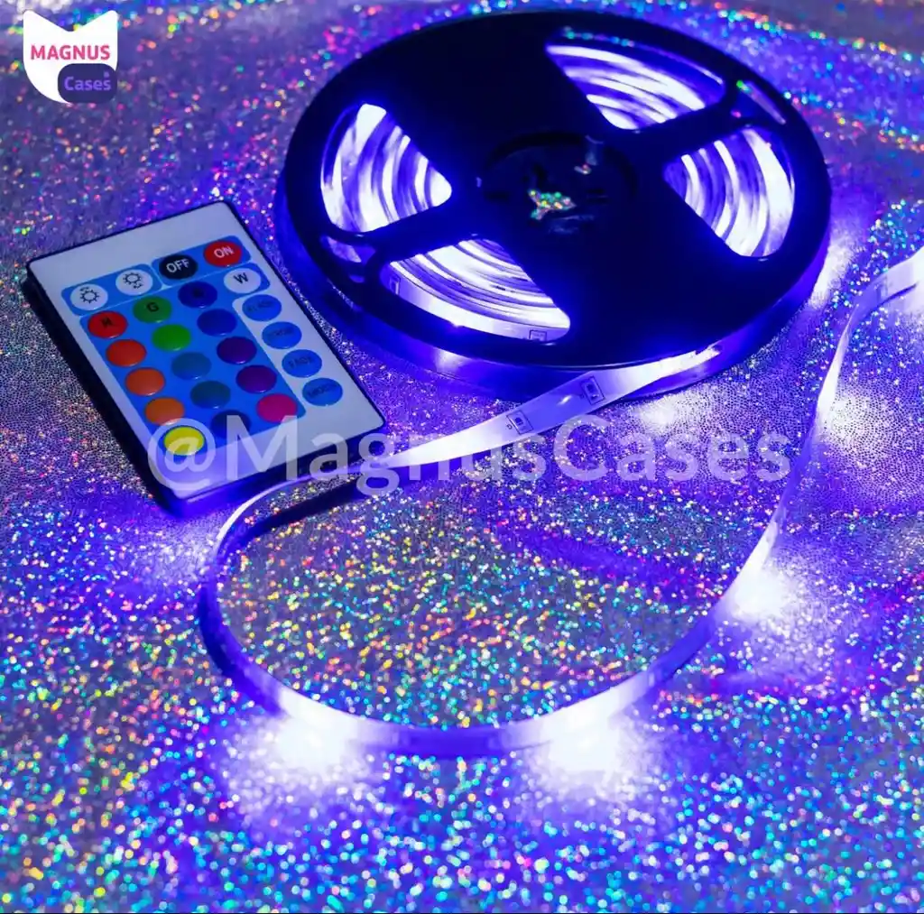 Tira de luces led de todo los colores🌈. Para decorar tus espacios favoritos como: habitaciones, cocinas, escritorios, espejos, televisores, paredes y demás 🤩 5 metros de largo Incluye autoadhesivo para fácil instalación 16 colores 4 efectos de parpadeo