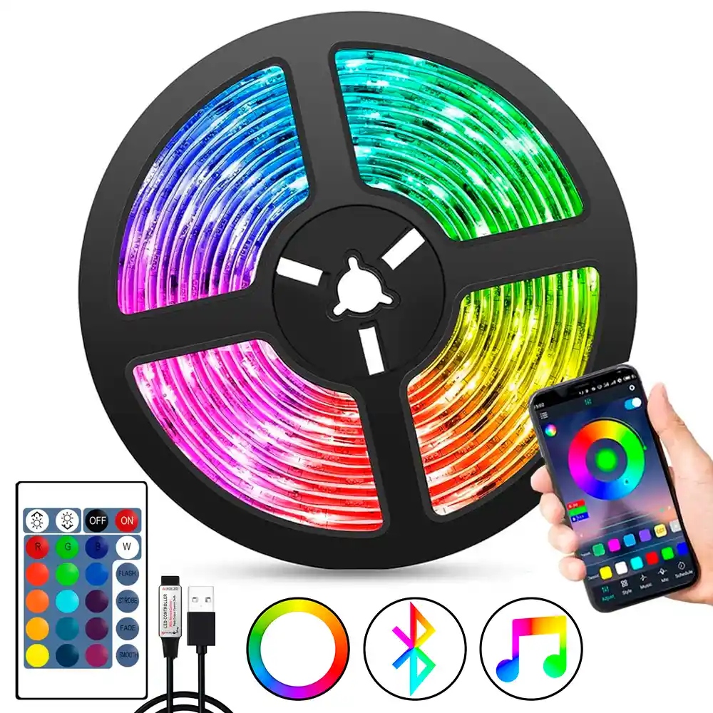 ¡Ilumina tu mundo con cintas LED brillantes y versátiles! Colores vibrantes y efectos mágicos en un toque. Descubre una nueva forma de luz. ● LONGITUD: 5 metros. ● CONECTIVIDAD: Bluetooth y control remoto. ● Logra hasta 16 millones de colores. ● Fácil de instalar. MODO MÚSICA: cambia de color al ritmo de la música, creando un ambiente romántico o de fiesta. ● DESPERTADOR: opción de despertador incluido.