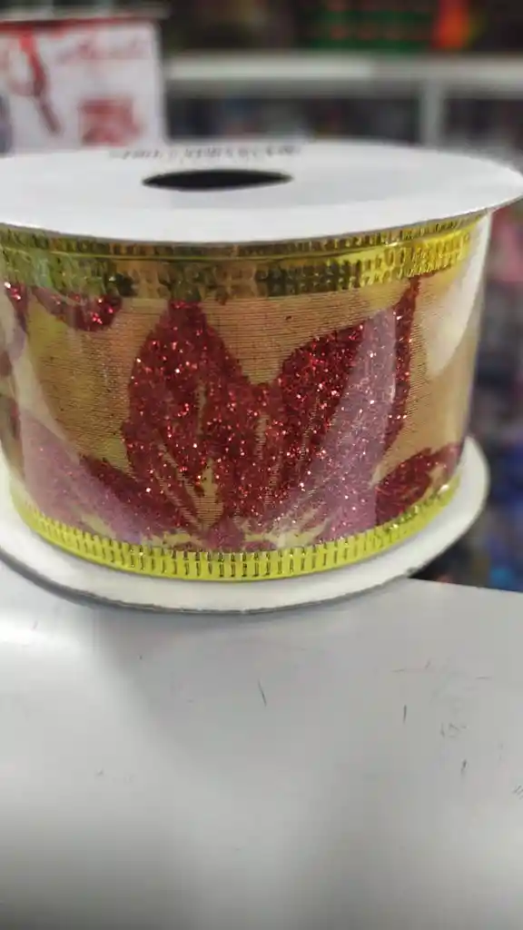 Cinta de Navidad Beige con Dorado y Flores Rojas de 4cm, 2mt con 74 cm