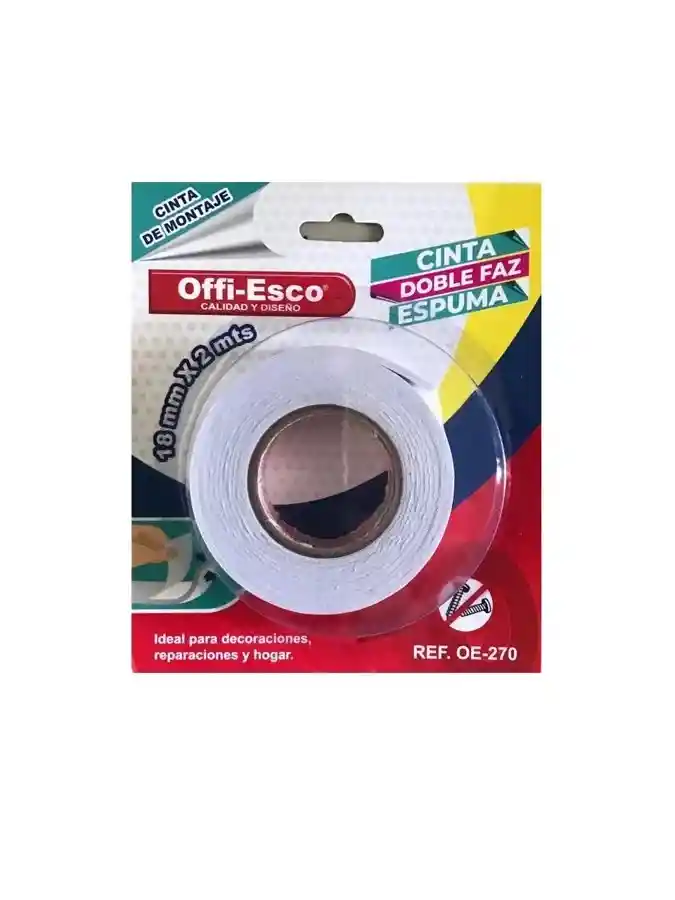Cinta Doble Faz de Espuma marca Offi Esco OE-270 Medida: 18 mm x 2 metros Cinta de montaje, ideal para decoraciones, reparaciones y hogar Excelente adherencia, versatil, fuerte y resistente Utilice en: metal, vidrio, plástico, porcelana, madera, cartón y papel