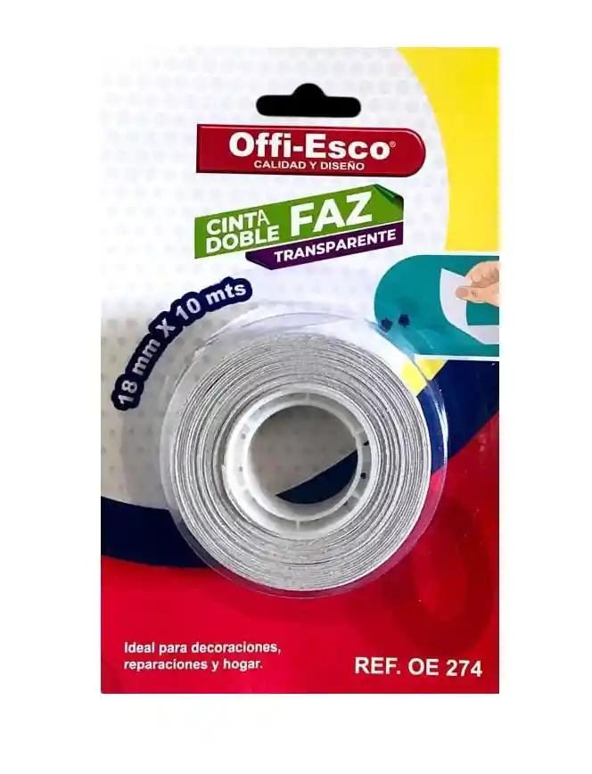 Cinta Doble Faz Transparente Offi Esco OE-274 Medida: 18 mm x 10 metros Ideal para decoraciones, reparaciones y hogar Excelente adherencia, versátil, fuerte y resistente Utilice en: metal, vidrio, plástico, porcelana, madera, cartón y papel