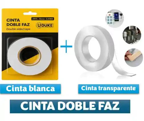 Cinta doble Faz x 2 (transparente y blanca) COMBO Cinta adhesiva doble faz realiza trabajos de fijación o montaje con esta cinta adhesiva doble cara. Utilízala en superficies como metal, madera, cristal, plástico o cerámica. Es muy útil para fijar, de forma permanente y segura, canaletas, cables, placas de circuitos en gabinetes, baterías ligeras en proyectos o hasta objetos decorativos.