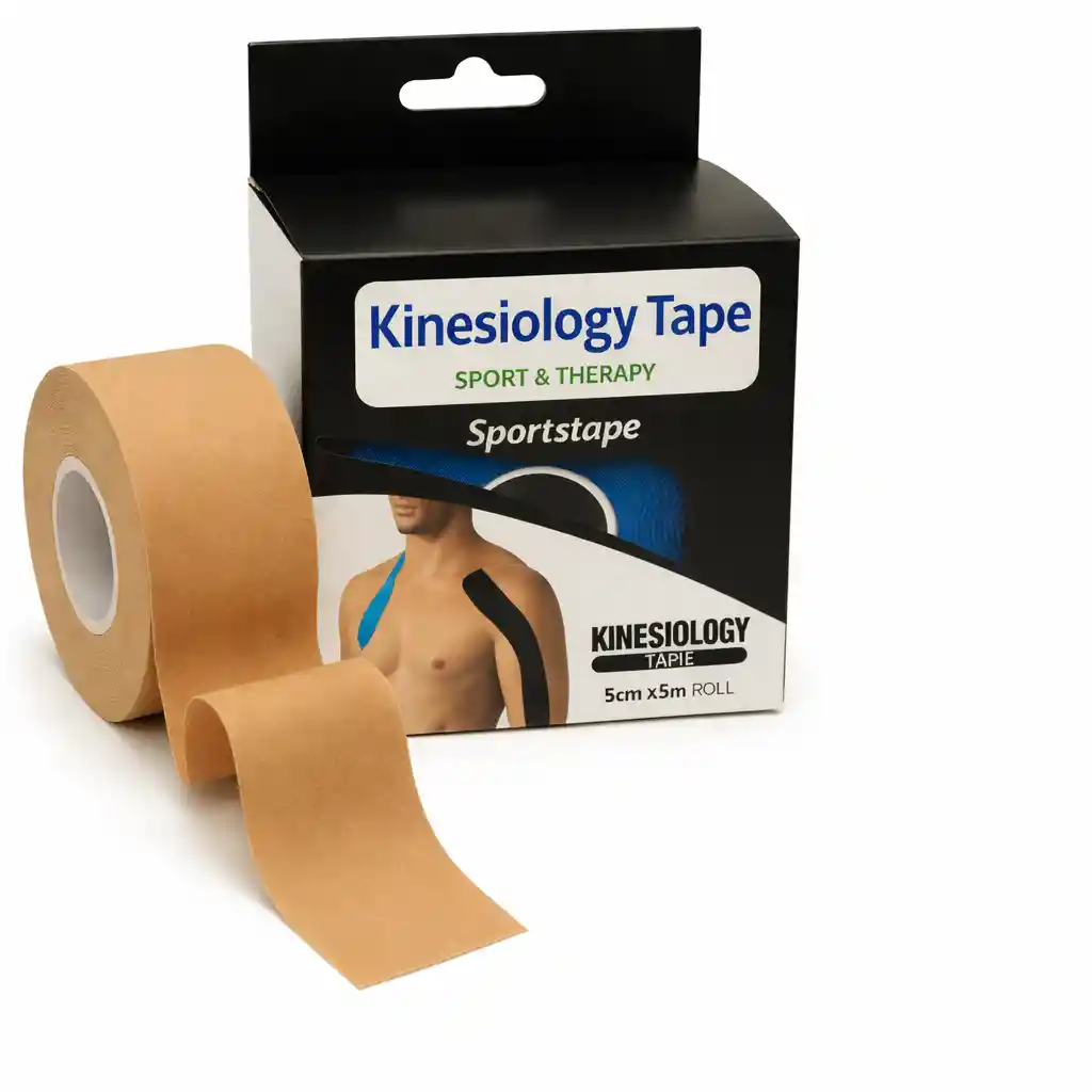 Nombre: Cinta Kinesiológica Sport & Therapy Características: Diseño: Rollo de cinta elástica, no medicada, con un ancho y grosor uniforme, diseñada para ser aplicada sobre la piel. Material: Tejido elástico y transpirable visible, con un adhesivo que no se observa pero es implícito en su uso (cinta). Elasticidad: Visiblemente elástica para permitir el rango completo de movimiento. Formato: Rollo individual con medidas indicadas en la caja de 5cm x 5m (ancho por largo). Enfoque: Soporte muscular y articular sin restringir el movimiento. Presentación: Se muestra un rollo en color piel/beige y otro en color azul brillante. Uso: Aplicación terapéutica y deportiva para proporcionar soporte a músculos y articulaciones, aliviar el dolor, reducir la inflamación y mejorar la propiocepción. Color: Café
