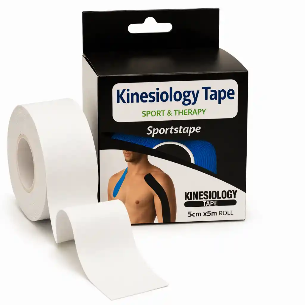 Nombre: Cinta Kinesiológica Sport & Therapy Características: Diseño: Rollo de cinta elástica, no medicada, con un ancho y grosor uniforme, diseñada para ser aplicada sobre la piel. Material: Tejido elástico y transpirable visible, con un adhesivo que no se observa pero es implícito en su uso (cinta). Elasticidad: Visiblemente elástica para permitir el rango completo de movimiento. Formato: Rollo individual con medidas indicadas en la caja de 5cm x 5m (ancho por largo). Enfoque: Soporte muscular y articular sin restringir el movimiento. Presentación: Se muestra un rollo en color piel/beige y otro en color azul brillante. Uso: Aplicación terapéutica y deportiva para proporcionar soporte a músculos y articulaciones, aliviar el dolor, reducir la inflamación y mejorar la propiocepción. Color: blanco
