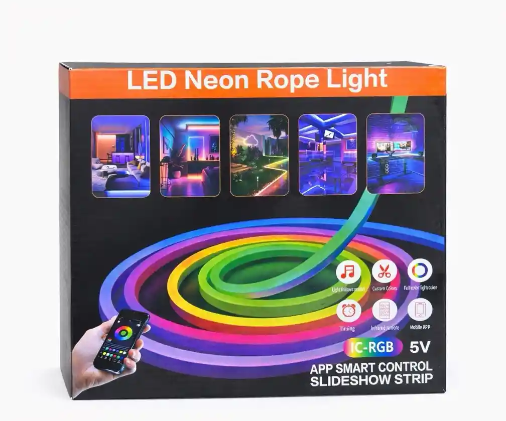 Las luces de neón han sido diseñadas para ser flexibles y adaptarse a todos tus interiores. ¿Se pueden cortar las tiras de neón para que se ajusten al tamaño deseado? Sí, están diseñados para cortarse en las marcas indicadas sin riesgo de daño. Además de ser flexibles, nuestras luces de neón son completamente impermeables. ¡Instálalo donde quieras! El paquete incluirá un mando a distancia, pero también será posible instalar la aplicación para controlar las luces de neón con el teléfono. Encontrarás la aplicación en el manual de usuario. Longitud: 5 m Impermeable: IP65 (neón impermeable, excepto adaptador y controlador) Control: Control a distancia, o mediante aplicación móvil Sincronización musical: reacciona en tiempo real a tu música Flexibilidad: Luces de neón suaves y flexibles, fáciles de instalar y moldear