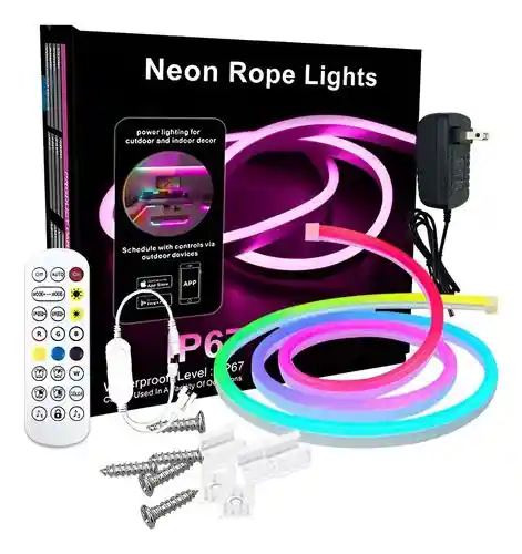 Cinta de luces de neón de 10 Metros, cuerda de luces LED impermeable IP67, diseño de bricolaje, sincronización de música, tira de luces de neón flexibles con control de aplicación. Iluminación Inteligente y Personalizable para Tu Espacio Transforma tu hogar u oficina con nuestra Luz de Neón LED RGBIC Tuya WiFi Bluetooth de 5 Metros. Este producto de alta calidad está diseñado para ofrecerte una experiencia de iluminación completamente personalizable, adaptándose a todas tus necesidades y preferencias. Características Destacadas: Compatibilidad con Tuya Smart Life: Controla y personaliza tu iluminación desde tu smartphone o tablet utilizando la aplicación Tuya Smart Life. Cambia colores, ajusta el brillo y programa horarios fácilmente. Conectividad Dual: Gracias a su conectividad WiFi y Bluetooth, tendrás un control total sobre tu iluminación en cualquier momento y lugar. Amplia Gama de Colores y Efectos: Experimenta con una paleta infinita de colores y efectos de iluminación para crear la atmósfera perfecta en cada espacio. Longitud de 10 Metros: Ideal para resaltar paredes, estantes, muebles y otros elementos decorativos, proporcionando un brillo suave y agradable. Beneficios: Ambiente Acogedor y Moderno: La iluminación LED RGBIC añade un toque moderno y elegante a cualquier espacio, creando un ambiente acogedor y personalizado. Fácil Integración con Dispositivos Inteligentes: Compatible con asistentes de voz como Alexa y Google Assistant, permitiendo el control mediante comandos de voz. Además, se integra perfectamente con otros dispositivos inteligentes de tu hogar. Opciones de Escenas Automatizadas: Crea y automatiza escenas personalizadas para cada momento del día, optimizando la iluminación según tus actividades y estados de ánimo. Aplicación inteligente y control remoto: las tiras de luces de neón de 10 Metros, soportan tanto la aplicación (conexión Bluetooth) como el control remoto de 24 teclas para el control, se pueden elegir diferentes modos, como intermitente, rápido, salto, decoloración, etc. Puedes elegir libremente controlar 16 millones de colores.