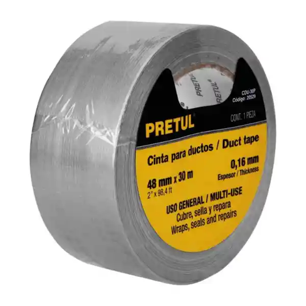 Cinta para ducto de 30 mts x 48mm marca Pretul. Grueso: 0.16 mm. Cubre, sella y repara.