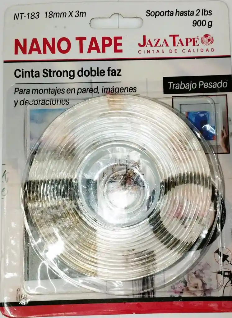 Cinta Strong doble faz 18mm X 3m, para montajes en pared, imageness y decoraciones; trabajo pesado, soporta hasta 2 lbs.