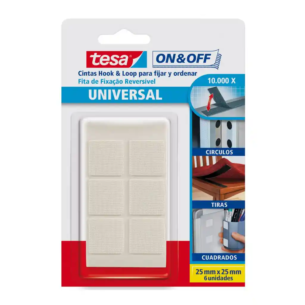 Es una cinta de tecnología versátil para montaje que puede utilizarse para fijar cualquier objeto ligero en una pared o cualquier otra superficie plana, mientras la deja con la opción de quita y pon con la frecuencia que deseada. Ideal para pegar cajas de herramientas tipo bolso o tela (kit de herramientas en automóviles, sujeción de objetos livianos o pesados dependiendo del metraje utilizado, fijar alfombras, pegar cortinas pequeñas, pegar angeos en puertas o ventanas, fijar sabanas al colchón y ajustar cuellos de prendas de vestir). Permite un agarre firme y seguro de objetos ligeros. permite organizar cosas pequeñas y tenerlas a la mano, permite pegar y despegar objetos hasta 10.000 veces
