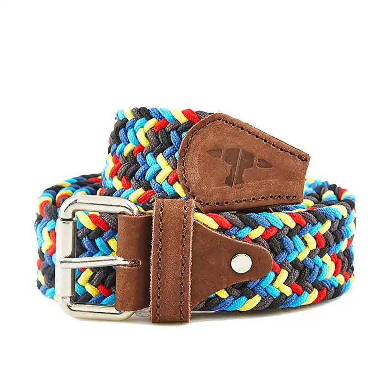 Materiales: Reata en nylon y poliéster, acabados en cuero nobuck, hebilla niquelada. Colores reata: amarillo, azul claro, azul oscuro, negro y gris. Color acabados: café Color hebilla: plateada niquelada.