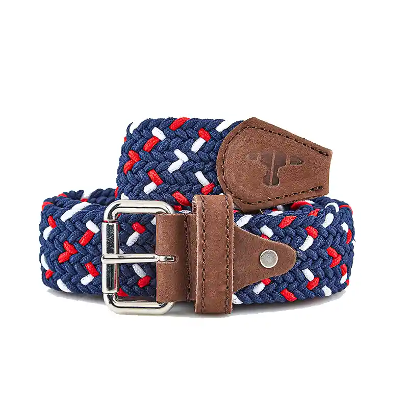 Materiales: Reata en nylon y poliéster, acabados en cuero nobuck, hebilla niquelada. Colores reata: azul, rojo y blanco. Color acabados: café. Color hebilla: plateada niquelada.