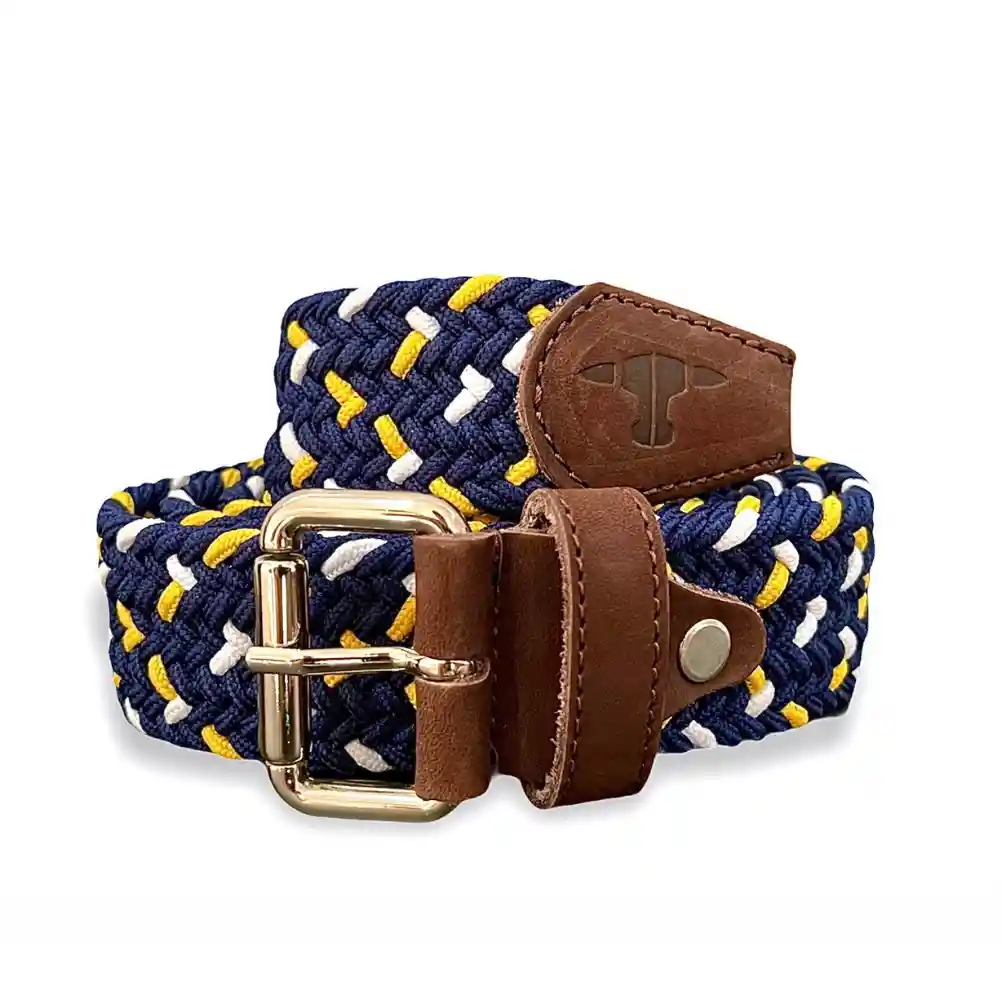 Materiales: Reata en nylon y poliéster, acabados en cuero nobuck, hebilla niquelada. Colores reata: amarillo, azul y blanco Color acabados: café. Color hebilla: plateada niquelada.