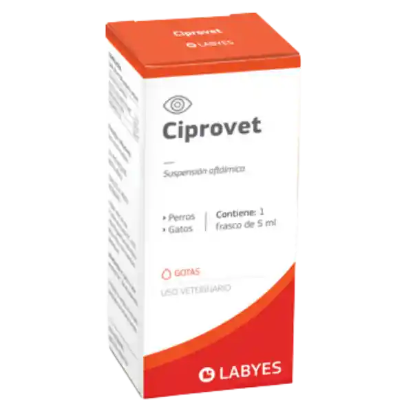 DESCRIPCIÓN: Ciprovet, colirio con antibiótico de amplio espectro y margen terapéutico. Contiene Ciprofloxacina en una base de Condroitín Sulfato al 20%. La Ciprofloxacina, pertenece al grupo de las fluoroquinolonas y se destaca por su acción sobre numerosos grupos bacterianos. El Condritin Sulfato estimula y organiza la reparación corneal, mejora la cicatrización y conserva en la superficie su humectación natural y transparencia. La mayor frecuencia de úlceras superficiales y patologías oculares en el segmento anterior, justifica la elección de este colirio. Ciprovet logra excelente concentración y máxima permanencia antibiótica a dicho nivel, promueve la rápida cicatrización y evita complicaciones.
