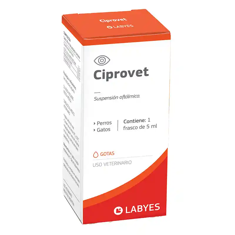 Beneficios y características: Ciprovet, colirio con antibiótico de amplio espectro y margen terapéutico. Contiene Ciprofloxacina en una base de Condroitín Sulfato al 20%. La Ciprofloxacina, pertenece al grupo de las fluoroquinolonas y se destaca por su acción sobre númerosos grupos bacterianos. El Condroitin Sulfato estimula y organiza la reparación corneal, mejora la cicatrización y conserva en la superficie su humectación natural y transparencia. La mayor frecuencia de úlceras superficiales y patologías oculares en segmento anterior, justifica la elección de este colirio. Ciprovet logra excelente concentración y máxima permanencia antibiótica a dicho nivel, promueve la rápida cicatrización y evita complicaciones. Indicaciones: Conjuntivitis bacteriana, déficit de lágrimas, queratitis seca contaminada y úlceras de córnea, provocadas por microorganismos susceptibles, lesiones y/o infecciones en cámara anterior. Está especialmente indicado frente a infecciones causadas por Pseudomona aeruginosa, bacteria responsable de la mayor parte de los procesos ulcerativos de la córnea o de sus complicaciones. Dosis y modo de empleo: Instilar una gota de Ciprovet en el ojo afectado cada 24 hs. En caso de infección ocular severa o úlceras de córnea, iniciar el tratamiento con una gota cada 12 hs y continuar cada 24 hs o de acuerdo al criterio del Médico Veterinario.