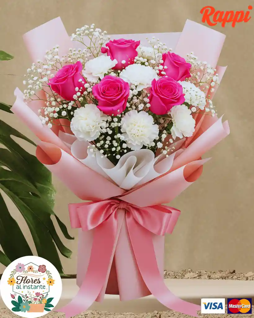 Un bouquet lleno de dulzura y elegancia. Envuelto en un cómodo papel coreano, este arreglo floral combina 6 delicadas rosas rosadas con 5 puros claveles blancos . Los toques de gipsófila y las hojas de rusco aportan un aire etéreo y fresco, creando la combinación perfecta para cualquier ocasión especial.