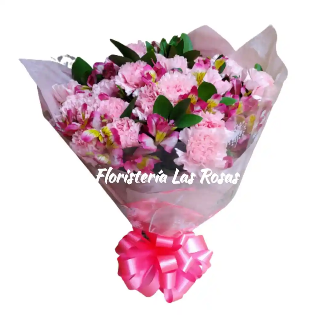 BOUQUET REDONDO EN AASTROMELIAS Y CLAVELES ACOMPAÑADAS DE FOLLAJE VERDE INCLUYE DECORACION MOÑO Y TARJETA PUEDES ELEGIR EL COLOR DE LAS FLORES A TU GUSTO