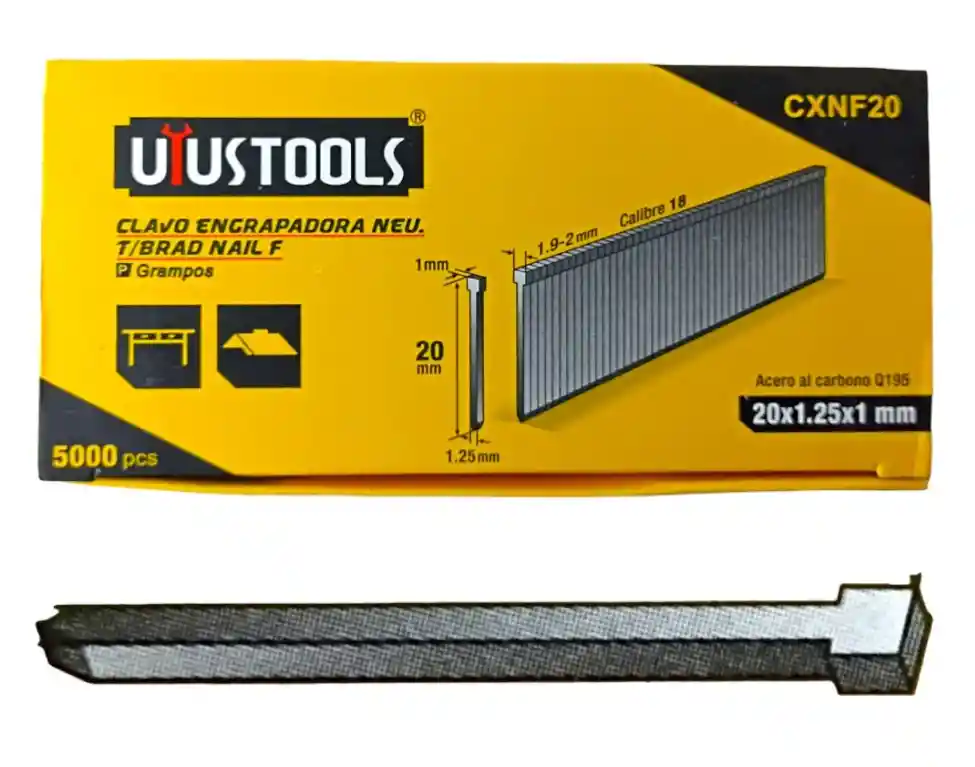 CAJA DE CLAVOS PARA CLAVADORA NEUMATICA UYUSTOOLS Punta Tip de acero con cabeza para el clavado de rodapiés, listones y rastreles sobre paredes de yeso con las clavadoras UYUSTOOLS y compatibles con muchas marcas. CARACTERÍSTICAS • Clavo Brand Nail F • Referencia CXNF25 • Largo de 25 mm • Ancho de 1.25 mm x 1 mm • Calibre 18 • Caja de 5000 unidades • Fabricados en Acero al Carbono Q195 • Terminado Zincado • MARCA UYUSTOOLS