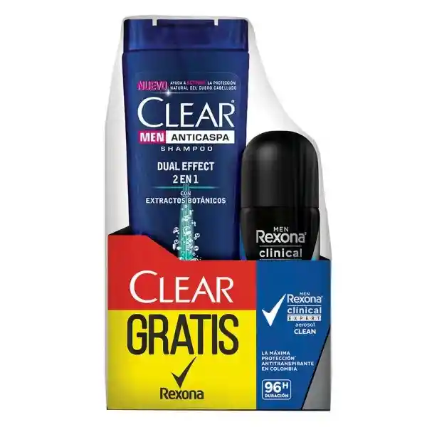 Contiene 2 Unidades Clear Shampoo Dual Men Anticaspa 400 mL + Desodorante Clinical Rexona 155 mL.