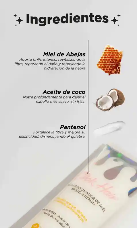 Este acondicionador cremoso de textura ligera hidrata las puntas, reduce el frizz y facilita el desenredado sin dejar el cabello pesado. La miel actúa como un humectante natural, sellando la hidratación y dejando tu cabello más suave, brillante y protegido contra los daños externos. Ideal para todo tipo de cabello.