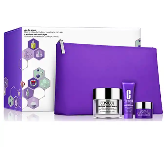 DETALLES Estos expertos en el cuidado de la piel son más inteligentes que el aspecto de las líneas y las arrugas. El suero corrector de arrugas Smart Clinical Repair reduce la aparición de líneas y arrugas. La hidaratante Smart Custom Repair nutre y protege con SPF. Clinique Smart Clinical Repair Wrinkle Correcting Eye Cream ayuda a fortalecer la delicada piel alrededor del área de los ojos.