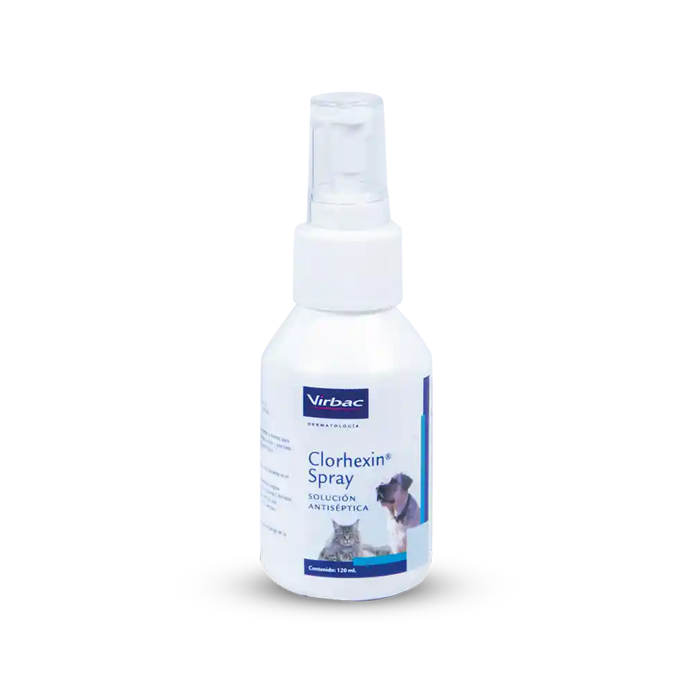 Indicaciones Solución antiséptica, útil para lavado y desinfección de heridas, antisepsia pre-quirúrgica, coadyuvante en patologías dérmicas, lavado antiséptico de pleura y peritoneo, lavado y desinfección del conducto auditivo externo, lavado prepucial y vaginal, patologías bucofaríngeas. Desinfección de objetos inanimados. Presentación Frasco por 120 mL. Principio activo Cada 100 mL contienen: Clorhexidina Digluconato.....0.5g Excipientes c.s.p..........100 mL Modo de uso Aplicar directamente en el área a tratar. Para lavado antiséptico de quemaduras, pleura y peritoneo debe diluirse 1 mL de Clorhexin® spray en 10 mL de suero fisiológico estéril. Para desinfección de instrumentos limpios realizar inmersión en la solución durante dos minutos. Especies En todas las especies. Precuauciones Consérvese en lugar fresco y seco al abrigo de la luz, MANTÉNGASE FUERA DEL ALCANCE DE LOS NIÑOS. CONSULTE AL MÉDICO VETERINARIO.