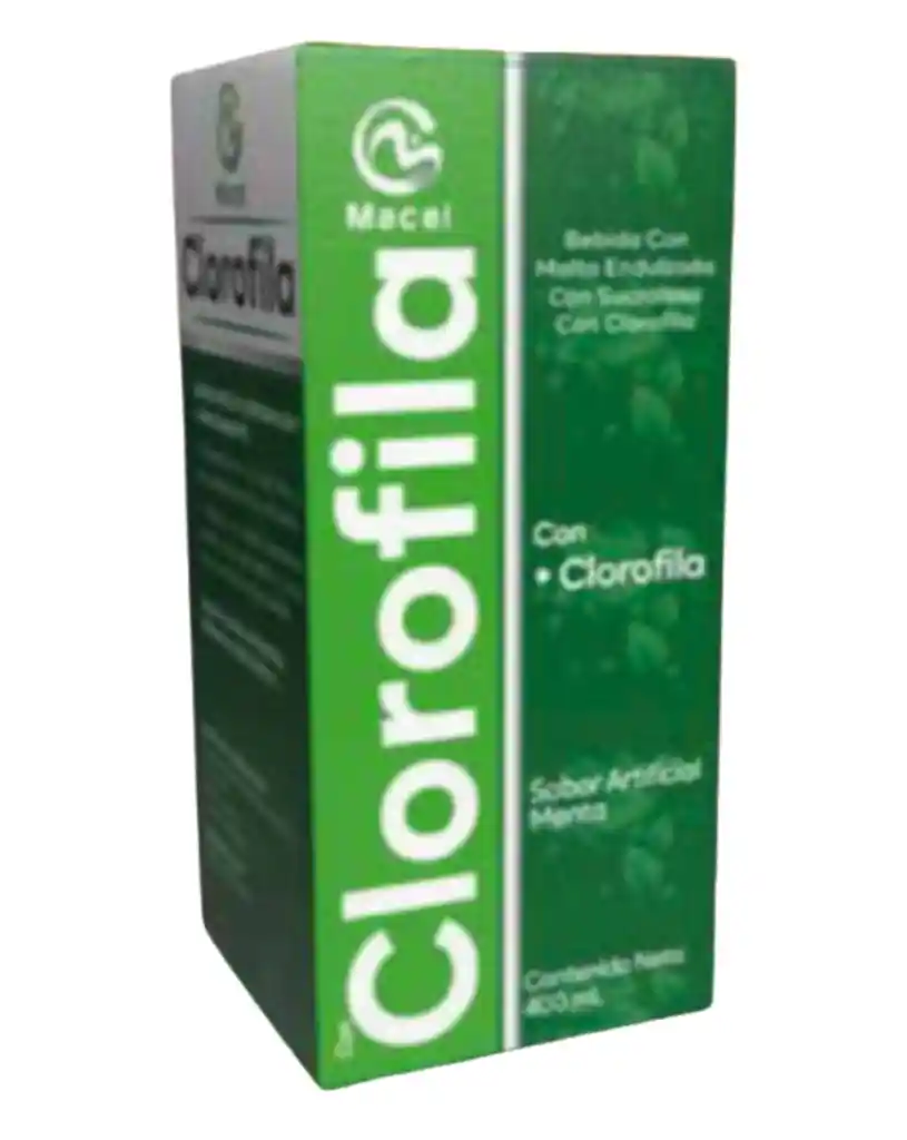CLOROFILA LÍQUIDA SABOR MENTA X 400 ml La CLOROFILA líquida entre muchos beneficios te ayuda a equilibrar los niveles de colesterol y los triglicéridos en la sangre, ademas, es favorable para la buena salud de tu sistema digestivo eliminando toxinas y residuos en el colón, hígado, estómago y vesícula. Mejora el rendimiento cardíaco con una buena circulación y disminuye la presión arterial limpiando venas y arterias. Ingredientes: Clorofila Presentación: Contenido líquido por 400 ml con agradable sabor menta. MODO DE CONSUMO Tomar dos cucharadas dos veces al día. Agite bien el producto antes de consumir. Vía de administración oral.