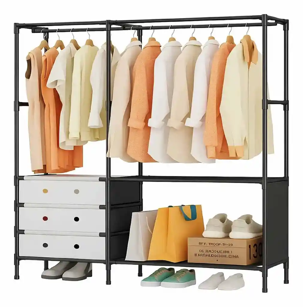 Este clóset organizador multifuncional es la solución definitiva para optimizar espacios reducidos, ofreciendo una estructura robusta y un diseño minimalista que se adapta perfectamente a dormitorios, vestidores o entradas. Fabricado con tubería de acero de alta resistencia y conectores de polímero reforzado, este armario abierto cuenta con una amplia barra superior para colgar prendas largas, tres gavetas integradas para ropa delicada u objetos personales, y múltiples niveles de estantería ideales para calzado y cajas organizadoras. Su configuración transpirable permite una ventilación constante de los textiles, evitando malos olores, mientras que su sistema de ensamble sencillo sin herramientas permite una instalación rápida y segura, convirtiéndose en un mueble versátil, duradero y elegante que transforma el desorden en una estación de moda impecable. FICHA TÉCNICA Producto: Clóset Armario Organizador Multifuncional Modelo: Doble Cuerpo con Gavetas Altura Total: 188 cm Ancho Total: 103 cm Profundidad: 41 cm Material de la Estructura: Tubería de acero con recubrimiento antioxidante Material de Conexiones: Plástico ABS de alta densidad Material de Repisas y Gavetas: Tela no tejida (Non-woven) impermeable Número de Gavetas: 3 Cajones organizadores con frontal rígido Capacidad de Cuelgue: 1 Barra horizontal de alta resistencia Tipo de Instalación: Ensamble manual por presión (No requiere herramientas) Peso Aproximado: 3.5 kg Garantía: 1 mes por defectos de fábrica POLÍTICA DE GARANTÍA Y RETRACTO Este mueble cuenta con 1 mes de garantía por defectos de fábrica; por favor revise todas las piezas al recibirlo, ya que no aplica retracto ni garantía tras su uso o si presenta daños por un mal ensamblaje forzado. Dispone de máximo 5 días para reportar novedades (piezas faltantes o daños de transporte) y, para cualquier devolución, es indispensable entregar el producto en su empaque original en buen estado, con todas sus partes y manuales completos.