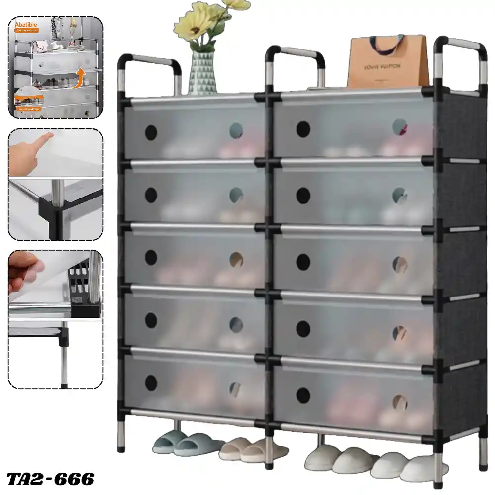 Closet Gabinete Plegable Zapatero Organizador De Zapatos 5 Niveles Doble TA2-666 ¡Despídete del desorden y dale a tus zapatos el cuidado que merecen! Nuestro Gabinete Zapatero de 5 Niveles doble es la solución perfecta para organizar tu calzado de manera elegante, protegiéndolo del polvo y optimizando cada rincón de tu habitación. Características: - Gran Almacenamiento: Cuenta con 5 niveles dobles, ofreciendo espacio suficiente para guardar toda tu colección de tenis, tacones, sandalias y zapatos formales. - Nivel Extra Inferior: Su diseño elevado deja un espacio libre a ras de piso, perfecto para guardar tus pantuflas o sandalias de uso diario para un acceso aún más rápido. - Puertas Abatibles: Sus cubiertas frontales te permiten identificar rápidamente el par que buscas, manteniendo todo oculto y visualmente ordenado. - Apertura Fácil: Cada puerta cuenta con un orificio circular ergonómico que facilita su apertura y cierre con un solo dedo, además de permitir la ventilación del calzado. - Superficie Útil: La parte superior del organizador es firme y plana, ideal para colocar bolsos, llaves, o incluso elementos decorativos. - Estructura Sólida: Construido con tubos metálicos de alta calidad y uniones de plástico reforzado que garantizan estabilidad. - Armado Sencillo: Sistema plegable y de ensamblaje intuitivo que no requiere herramientas pesadas ni complicaciones. -Ahorro de Espacio: Diseño compacto, perfecto para apartamentos o habitaciones pequeñas. -Multifuncional: También puede usarse para ropa doblada, juguetes o accesorios. -Fácil Limpieza: Material resistente a la humedad, se limpia fácilmente con un paño húmedo. -Diseño Ventilado: Orificios de ventilación que ayudan a mantener los zapatos frescos. - Medidas Aproximadas: 82 X 28 X 128Cm
