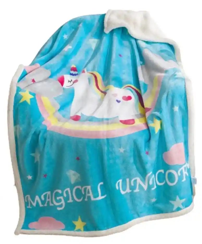 Cobija ovejera color azul con blanco en estampado de unicornio Medidas: 100 X 140 CM