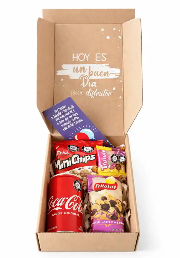 Coca Cola Box incluye: 1 Bebida Coca Cola Lata (235ml), 1 Mani con Pasas (50g), 1 Paquete Minichips (35g), 2 gomas trululu. Caja, papel picado, moño y tarjeta con mensaje. La caja se envia en una bolsa sellada con sticker alusivo a la celebración. Tarjetas disponibles: Cumpleaños,Amor, Feliz Dia, Feliz dia Mujer, Feliz dia hombre, Mamá, Papá.