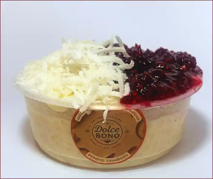 Exquisito y cremoso arroz de leche de la abuela acompañado de coco rallado y salsa de frutos rojos artesanal