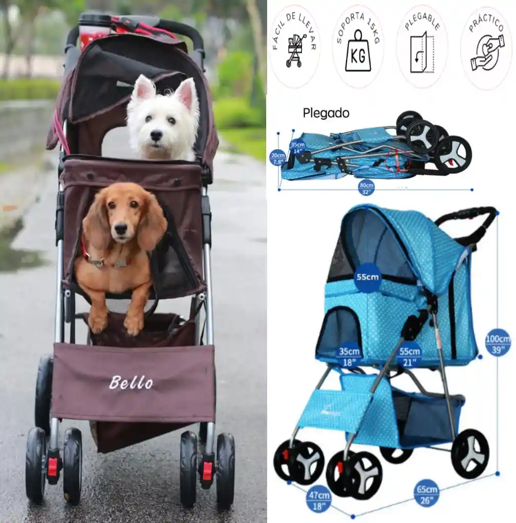 Coche para perros pequeños y medianitos, con 3 ventanas en malla, puerta trasera, ventanilla superior para ir viendo que esta haciendo tu peludo, estructura de Acero liviana y plegable para poder guardarlo y llevarlo en el carro con facilidad, espacio de almacenamiento en la parte inferior, 2 cinturones de seguridad, porta vasos, almohadilla interna impermeable, con frenos en las ruedas traseras y ruedas delanteras direccionales con giro de 360 grados y material impermeable grueso reforzado. Soporta hasta 15 kilos. Color sujeto a disponibilidad en tienda. Tamaño total del coche: 65 cms de largo x 47 cms de ancho x 99 cms de alto. Medidas de la cesta donde va la mascota: 55 cms de largo x 35 cms de ancho x 55 cms de alto.FÁCIL DE LLEVAR SOPORTA HASTA 15KG PLEGABLE